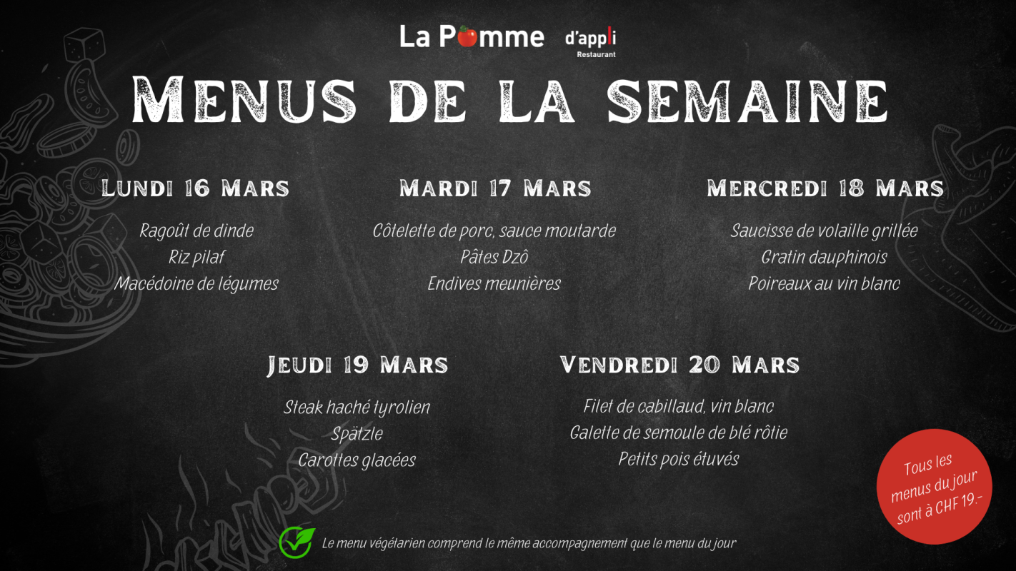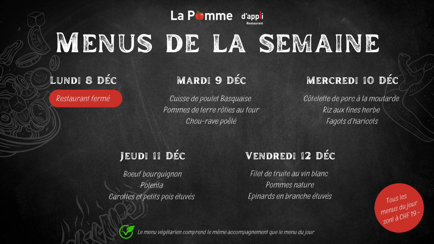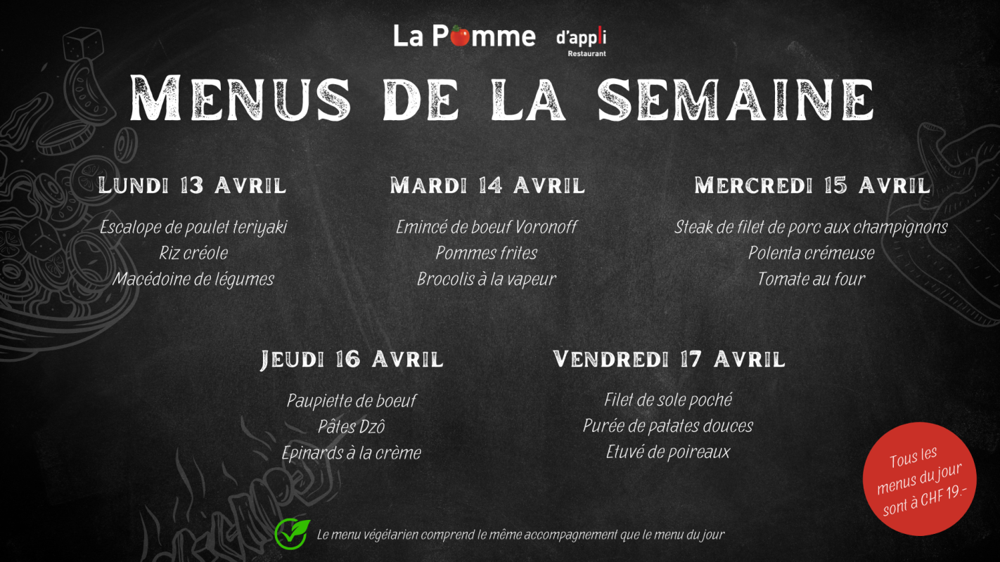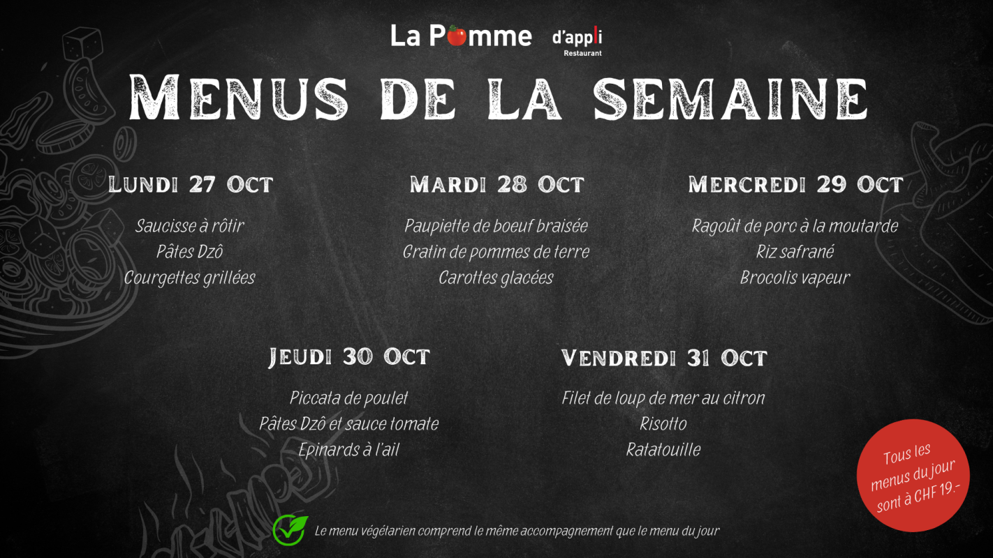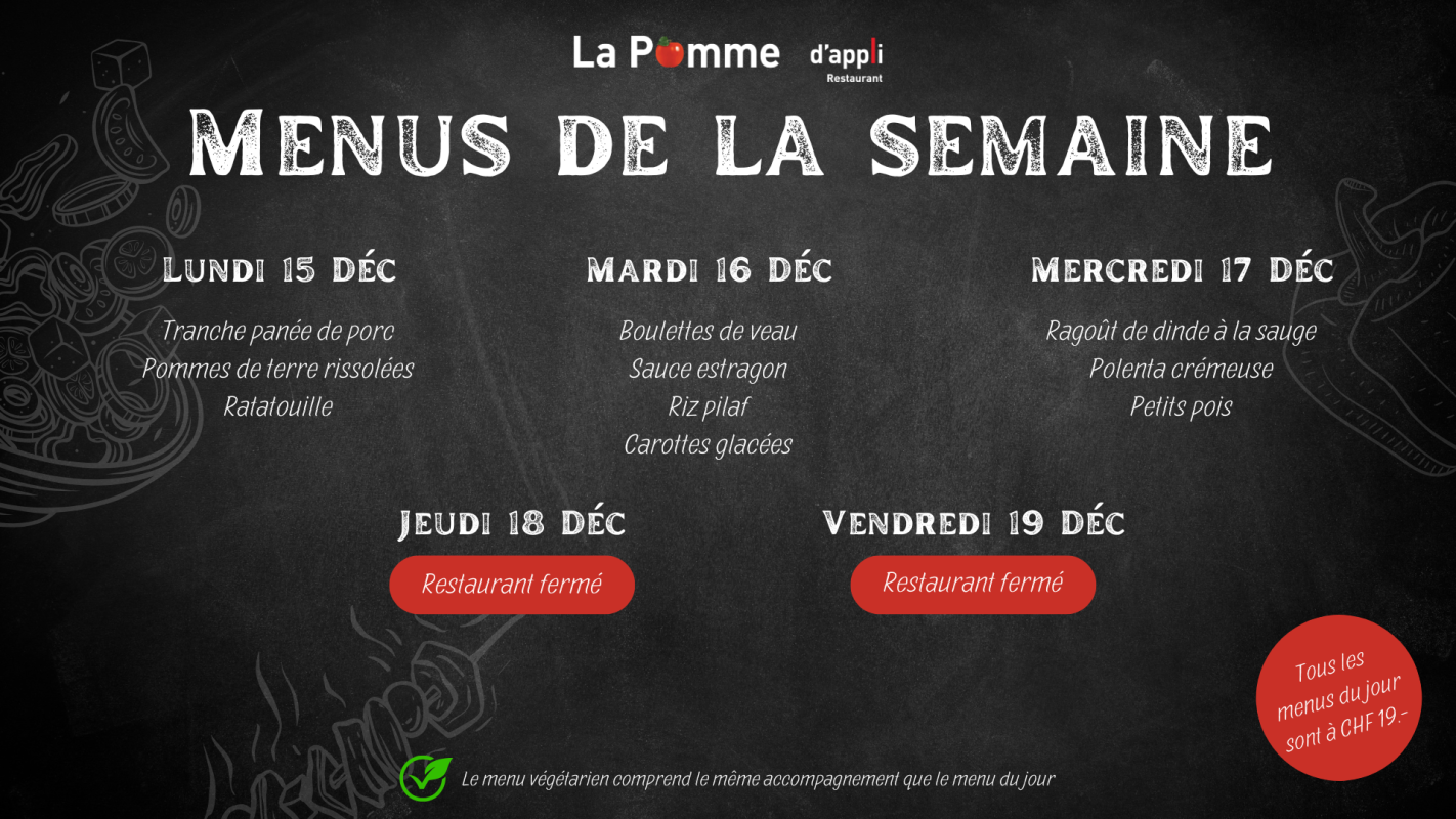 Notre restaurant La Pomme d'appli aux Peupliers accueille essentiellement le personnel de l'institution et a la capacité d'accueillir 70 personnes et 20 additionnelles en terrasse. Nous proposons :