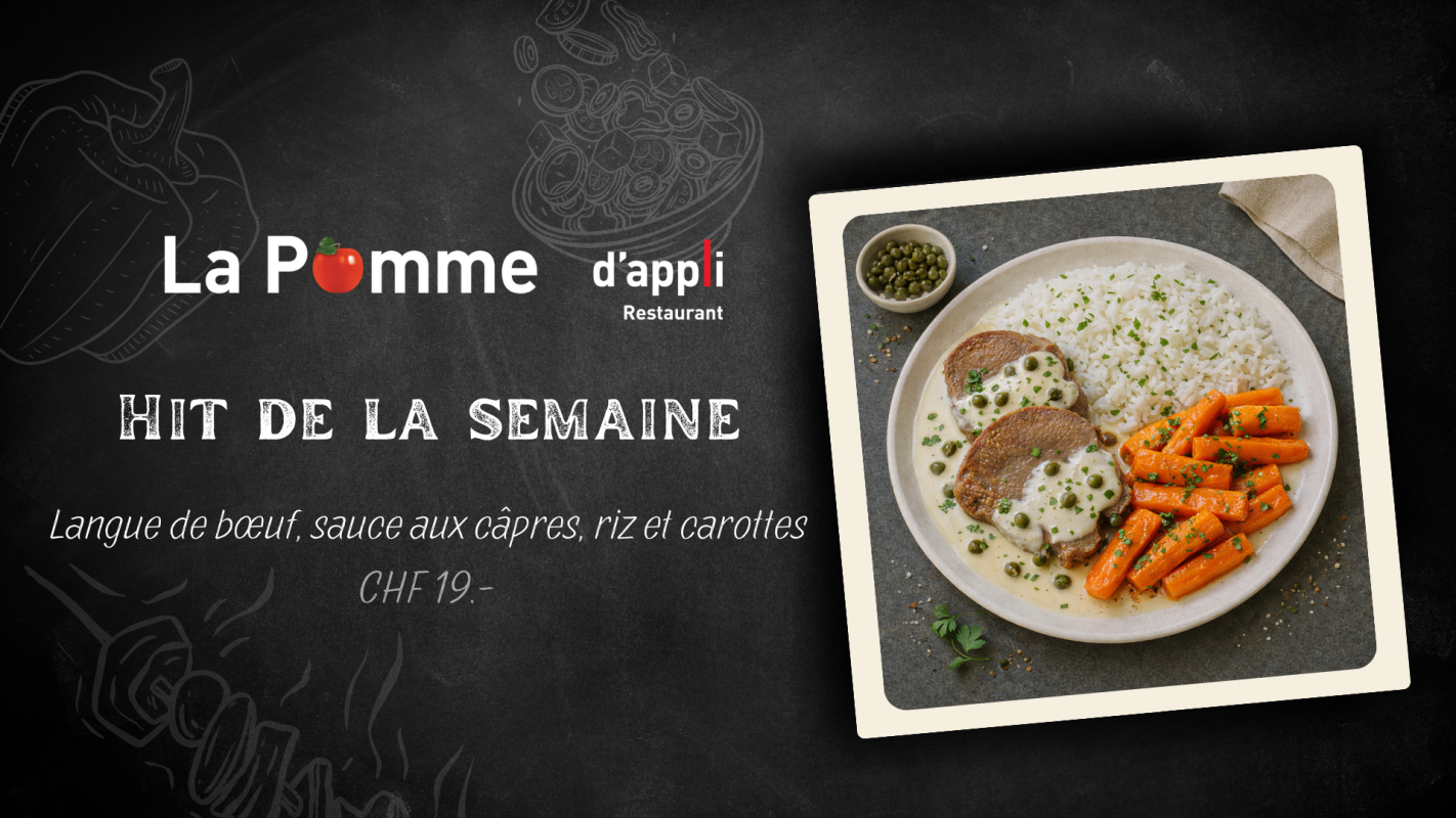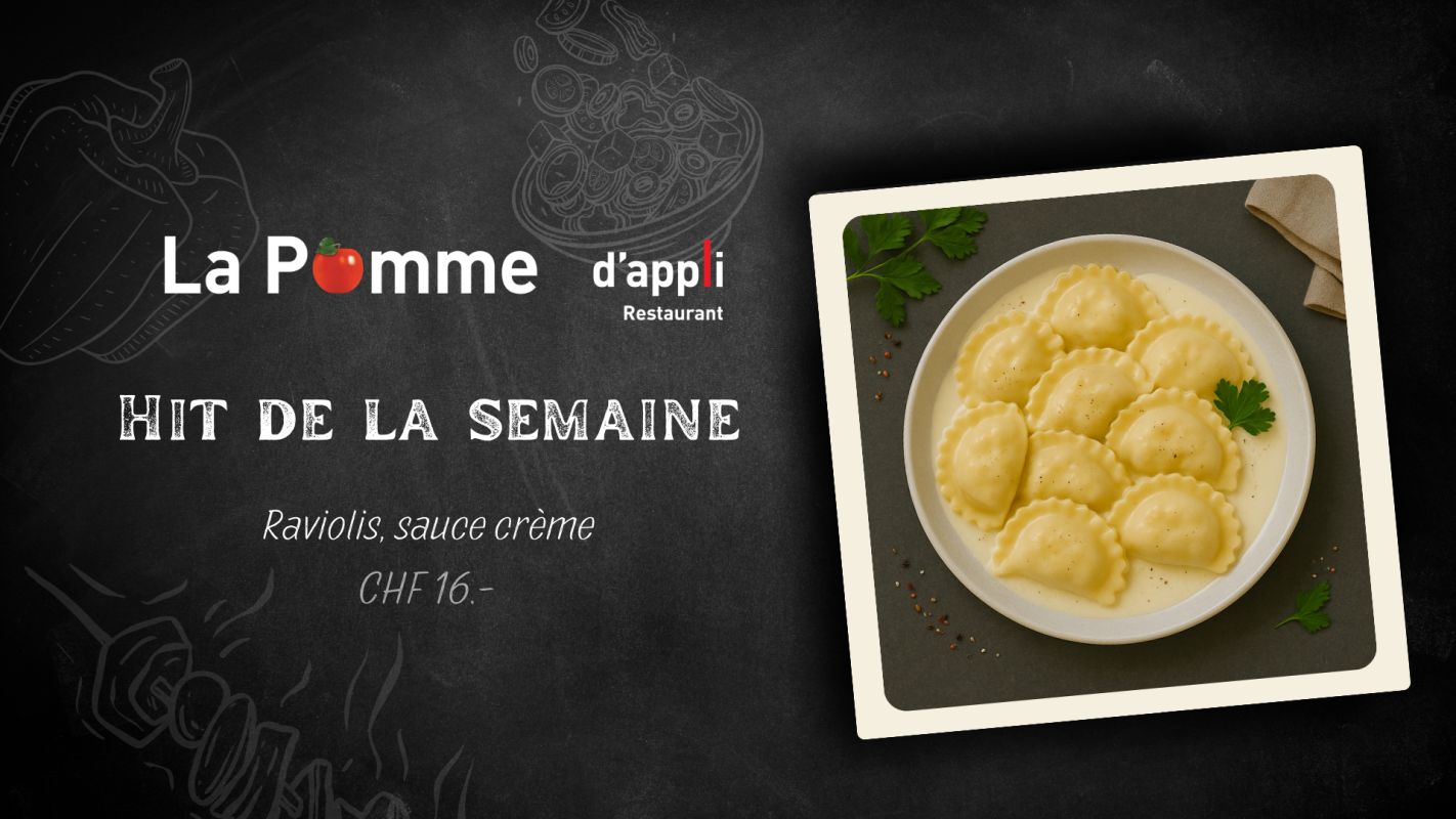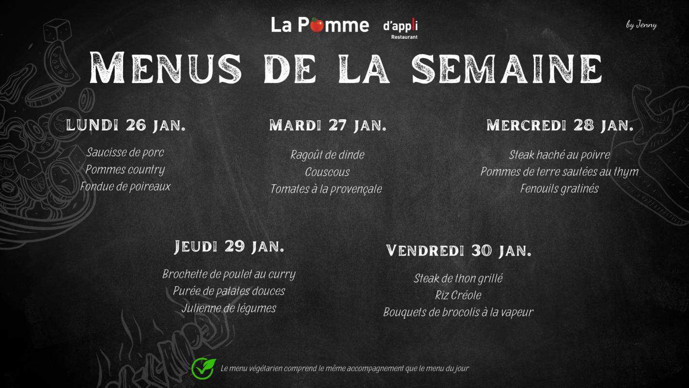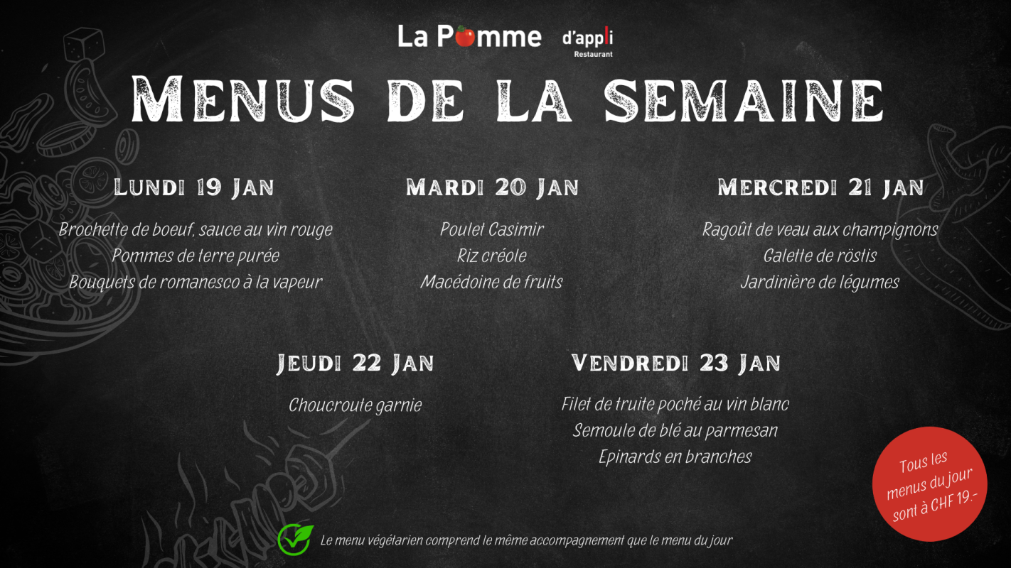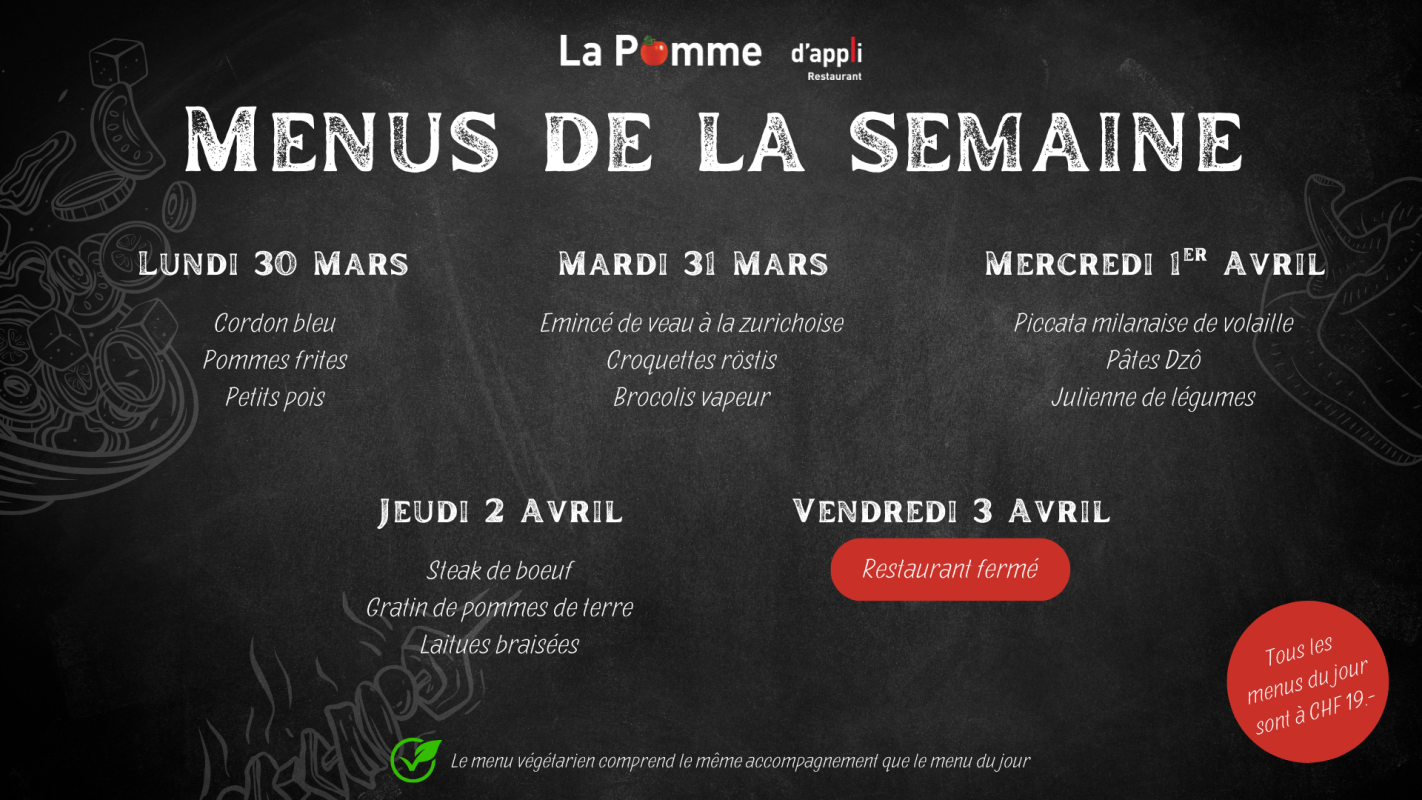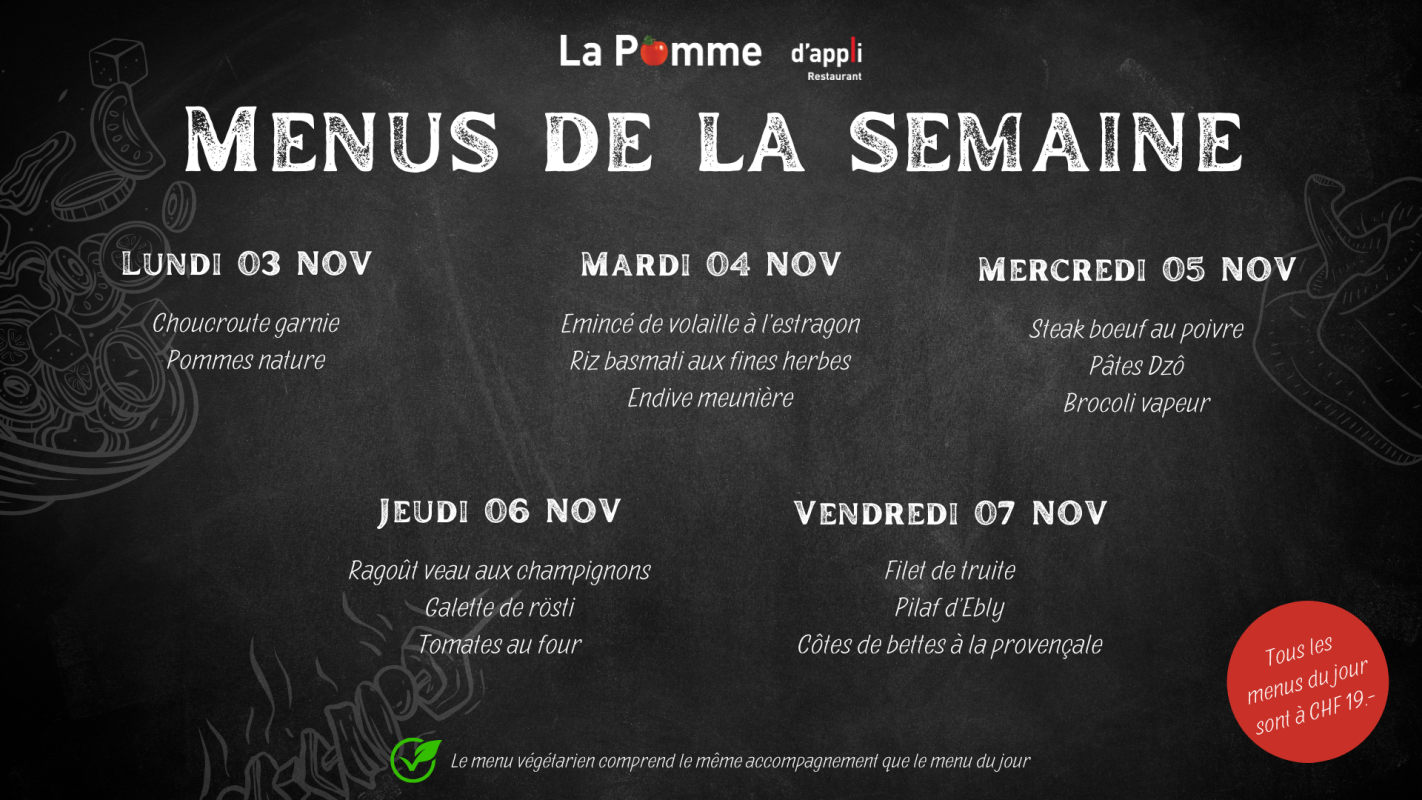 Notre restaurant La Pomme d'appli aux Peupliers accueille essentiellement le personnel de l'institution et a la capacité d'accueillir 70 personnes et 20 additionnelles en terrasse. Nous proposons :
